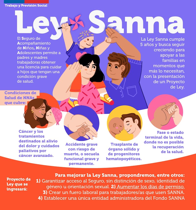 El Seguro de Acompañamiento para Niños, Niñas y Adolescentes, mejor conocido como Ley Sanna, es un seguro obligatorio que permite a las madres y padres trabajadores obtener una licencia que les permita ausentarse al trabajo para poder acompañar, asistir o cuidar a su hijo o hija que tenga una condición grave de salud.