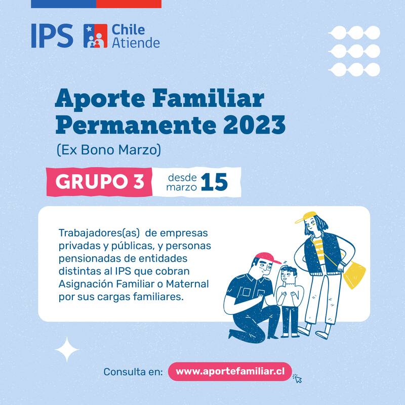 Este 15 de marzo comienza el tercer pago del Bono Marzo 2023, llamado ahora Aporte Familiar Permanente, que corresponde a quiénes aparezcan en la última nómina de beneficiarios.
