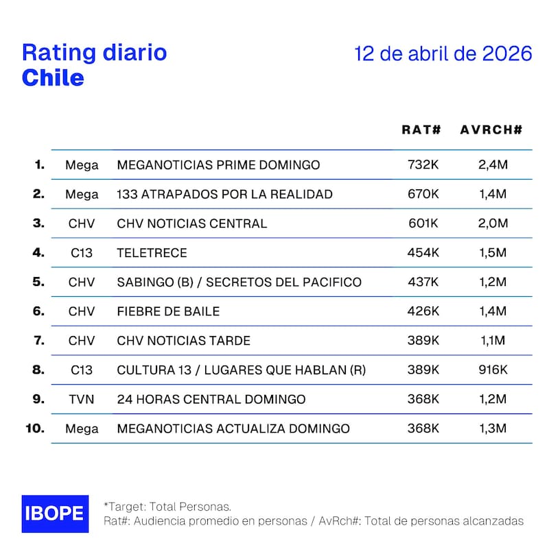 Por Equipo de GrowthRating del domingo 12 de abril en Chile: cómo le fue a CHV, Mega, Canal 13 y TVN