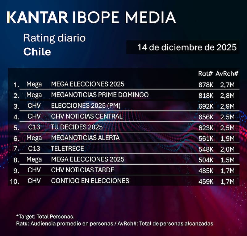Por Equipo de GrowthRating del domingo 14 de diciembre en Chile: cómo le fue a CHV, Mega, Canal 13 y TVN