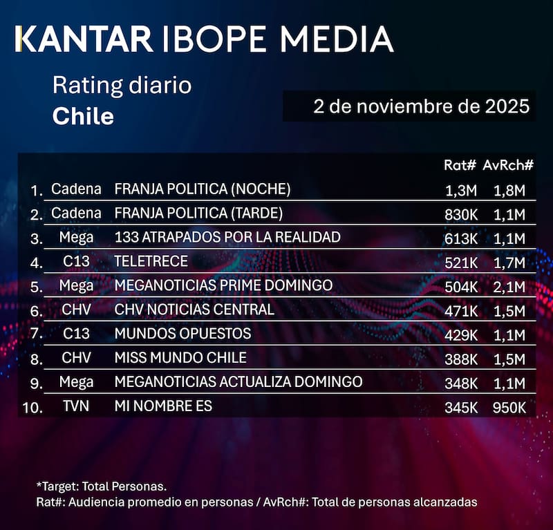 Por Equipo de GrowthRating del domingo 2 de noviembre en Chile: cómo le fue a CHV, Mega, Canal 13 y TVN