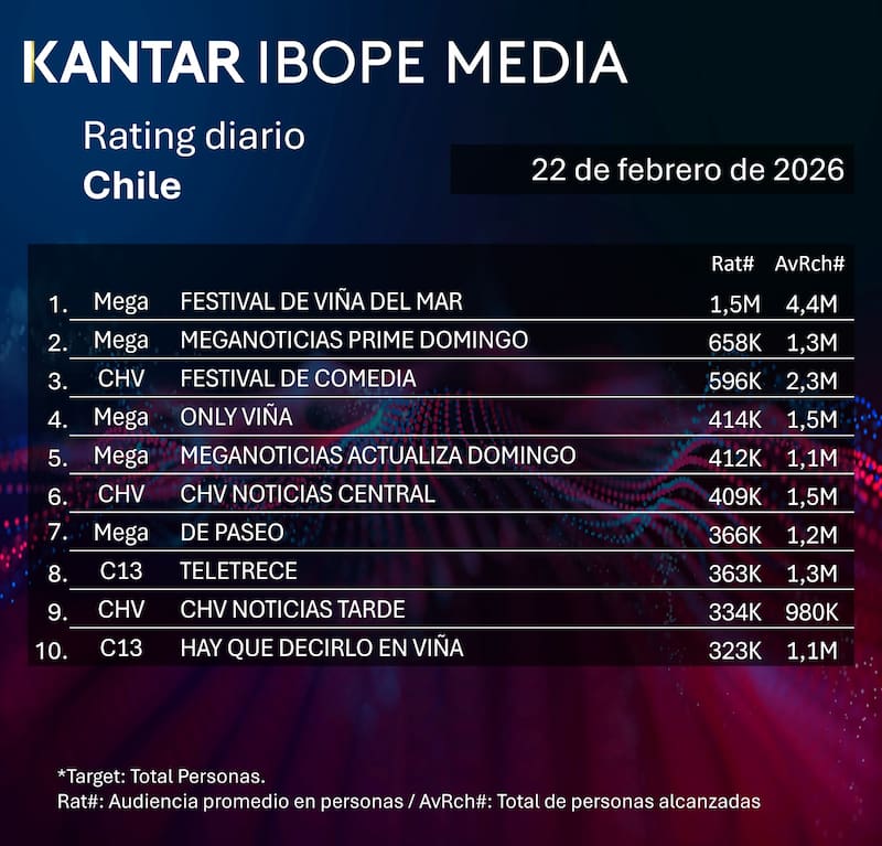 Por Equipo de GrowthRating del domingo 22 de febrero en Chile: cómo le fue a CHV, Mega, Canal 13 y TVN