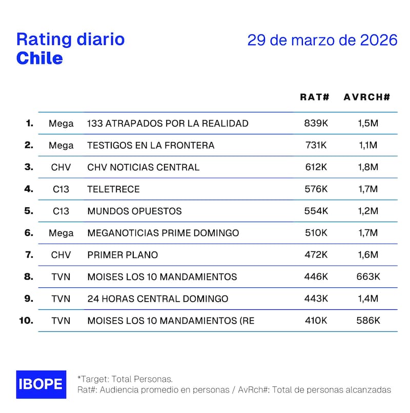 Por Equipo de GrowthRating del domingo 29 de marzo en Chile: cómo le fue a CHV, Mega, Canal 13 y TVN