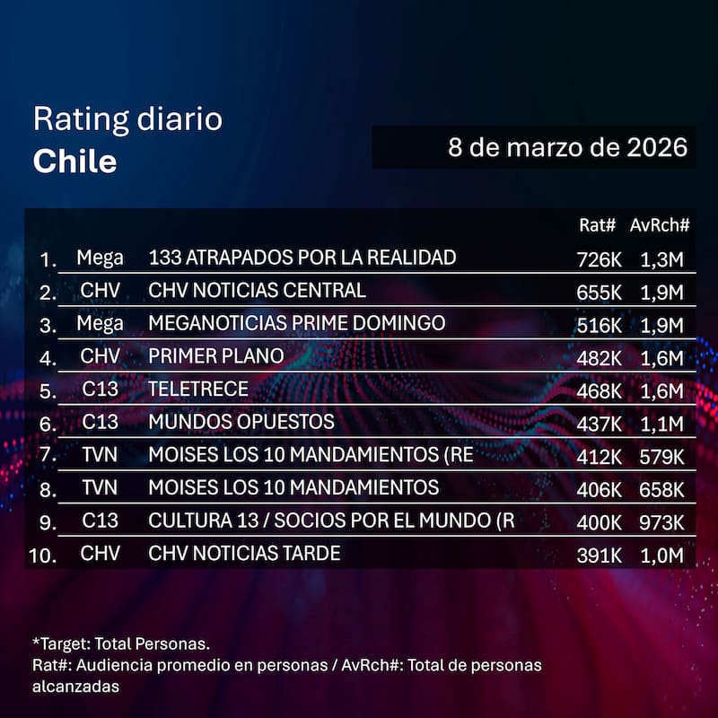 Por Equipo de GrowthRating del domingo 8 de marzo en Chile: cómo le fue a CHV, Mega, Canal 13 y TVN