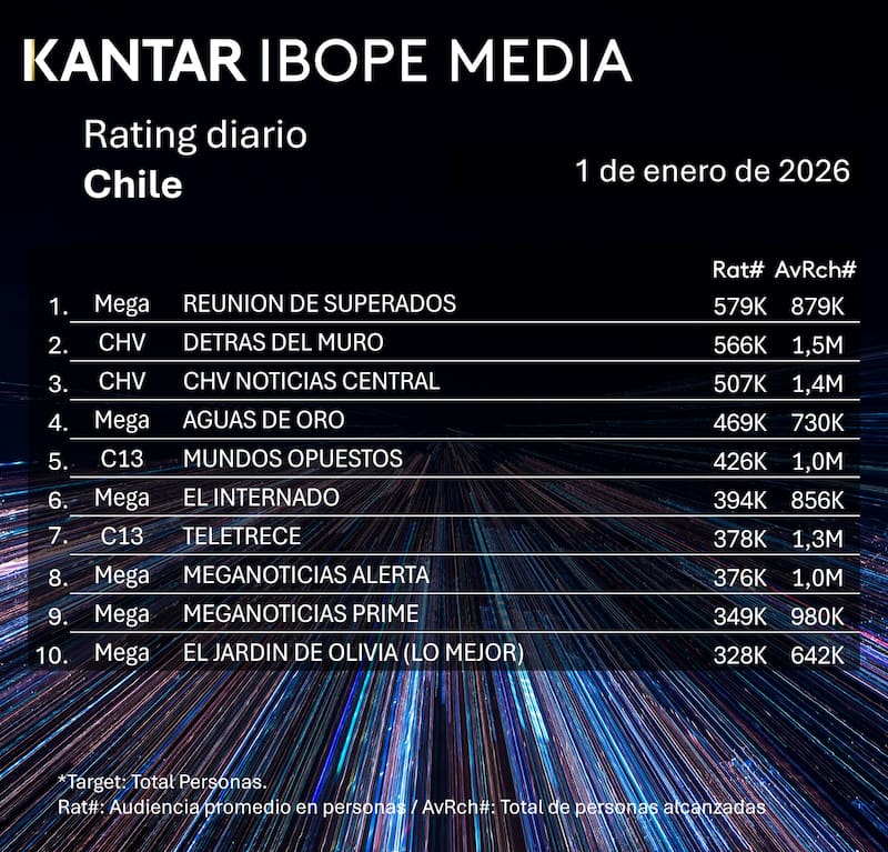 Por Equipo de GrowthRating del jueves 1 de enero en Chile: cómo le fue a CHV, Mega, Canal 13 y TVN