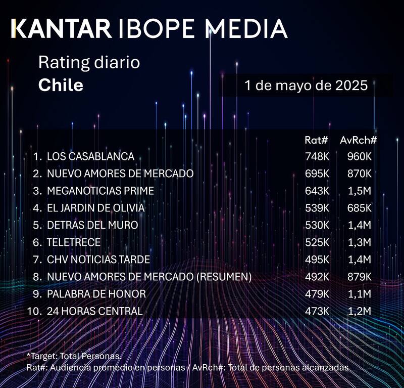 Por Baltasar DazaRating del jueves 1 de mayo en Chile: cómo le fue a CHV, Mega, Canal 13 y TVN