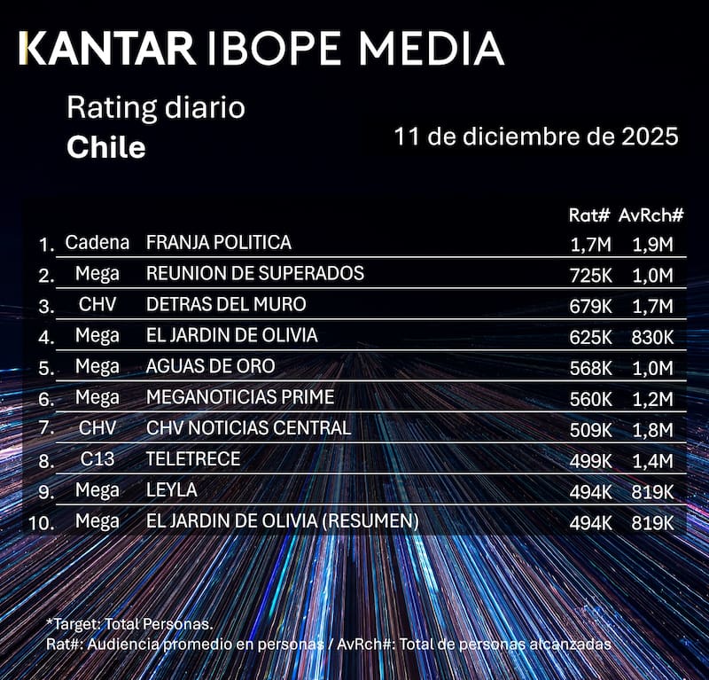 Por Equipo de GrowthRating del jueves 11 de diciembre en Chile: cómo le fue a CHV, Mega, Canal 13 y TVN