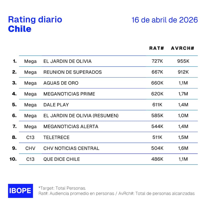 Por Equipo de GrowthRating del jueves 16 de abril en Chile: cómo le fue a CHV, Mega, Canal 13 y TVN