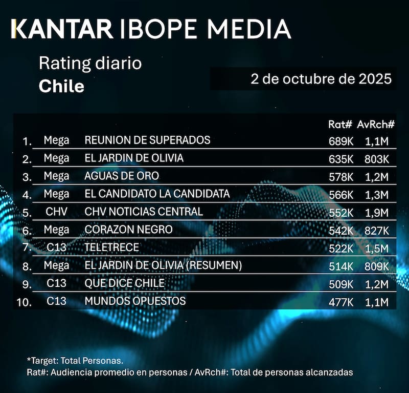 Rating del jueves 2 de octubre en Chile: cómo le fue a CHV, Mega, Canal 13 y TVN