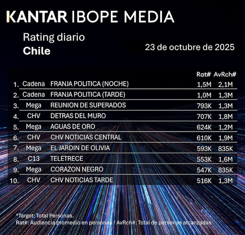 Por Equipo de GrowthRating del jueves 23 de octubre en Chile: cómo le fue a CHV, Mega, Canal 13 y TVN