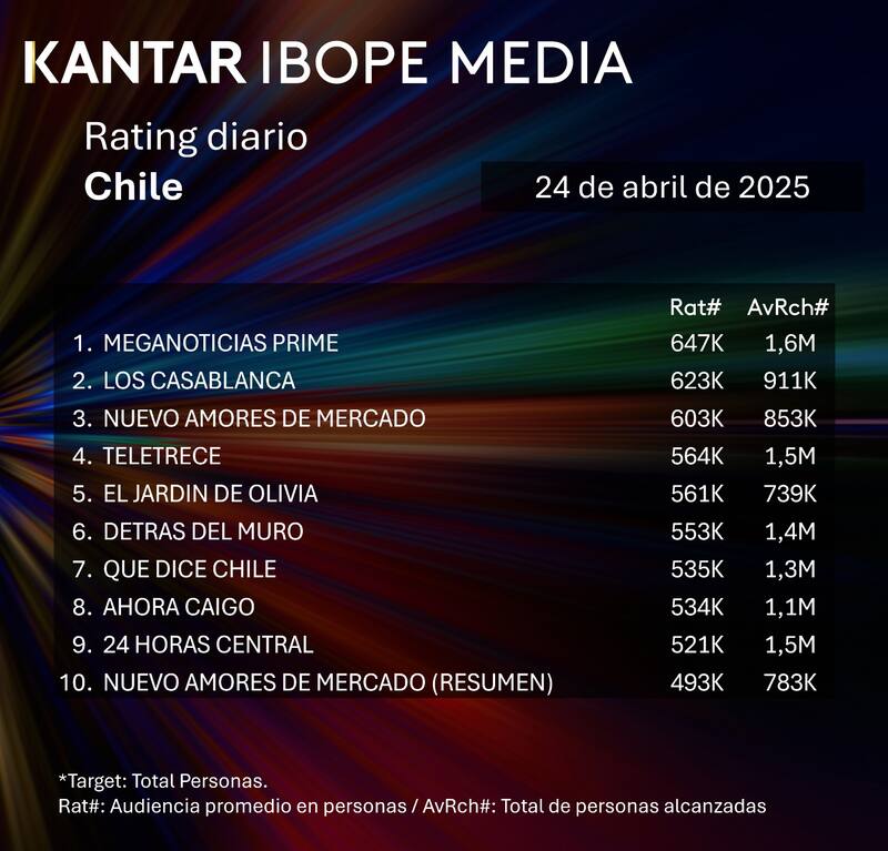 Por Baltasar DazaRating del jueves 24 de abril en Chile: cómo le fue a CHV, Mega, Canal 13 y TVN