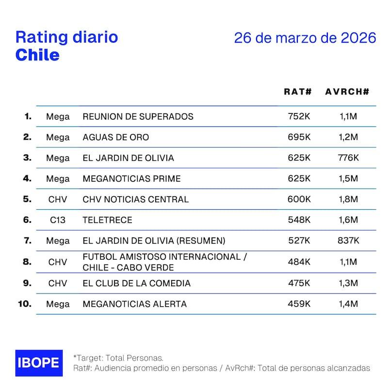 Por Equipo de GrowthRating del jueves 26 de marzo en Chile: cómo le fue a CHV, Mega, Canal 13 y TVN