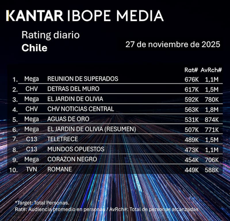 Por Equipo de GrowthRating del jueves 27 de noviembre en Chile: cómo le fue a CHV, Mega, Canal 13 y TVN