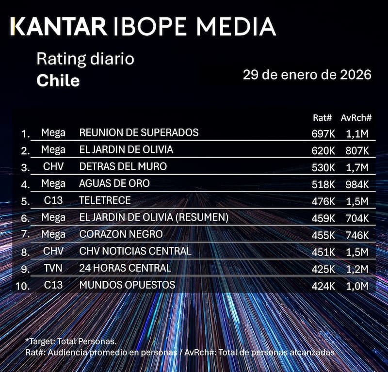 Por Equipo de GrowthRating del jueves 29 de enero en Chile: cómo le fue a CHV, Mega, Canal 13 y TVN
