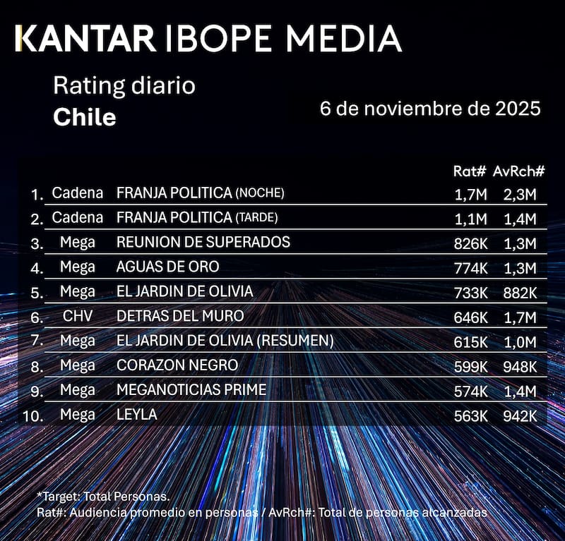 Por Equipo de GrowthRating del jueves 6 de noviembre en Chile: cómo le fue a CHV, Mega, Canal 13 y TVN