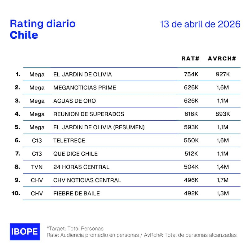Por Equipo de GrowthRating del lunes 13 de abril en Chile: cómo le fue a CHV, Mega, Canal 13 y TVN