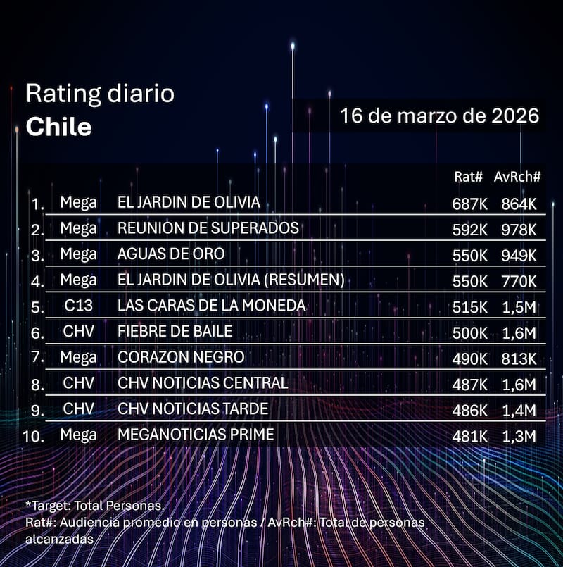 Por Equipo de GrowthRating del lunes 16 de marzo en Chile: cómo le fue a CHV, Mega, Canal 13 y TVN