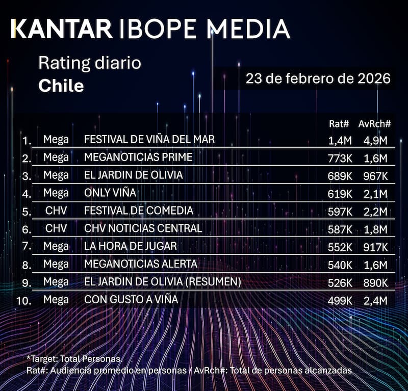 Por Equipo de GrowthRating del lunes 23 de febrero en Chile: cómo le fue a CHV, Mega, Canal 13 y TVN
