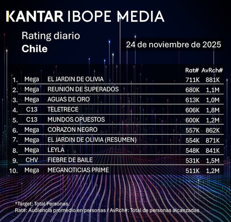 Por Equipo de GrowthRating del lunes 24 de noviembre en Chile: cómo le fue a CHV, Mega, Canal 13 y TVN