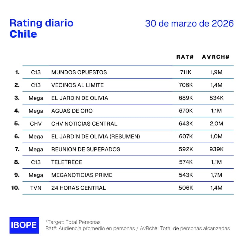 Por Equipo de GrowthRating del lunes 30 de marzo en Chile: cómo le fue a CHV, Mega, Canal 13 y TVN