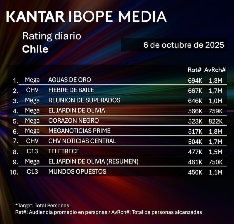 Rating del lunes 6 de octubre en Chile: cómo le fue a CHV, Mega, Canal 13 y TVN