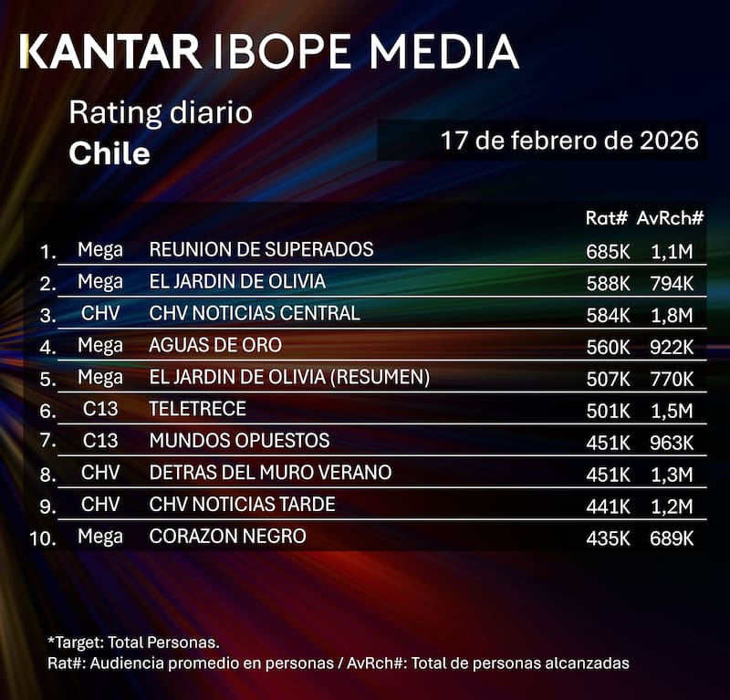 Por Equipo de GrowthRating del martes 17 de febrero en Chile: cómo le fue a CHV, Mega, Canal 13 y TVN
