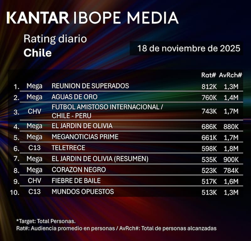 Por Equipo de GrowthRating del martes 18 de noviembre en Chile: cómo le fue a CHV, Mega, Canal 13 y TVN