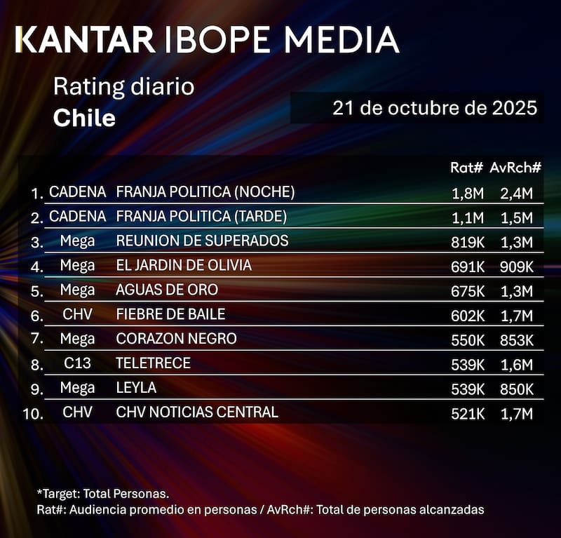 Por Equipo de GrowthRating del martes 21 de octubre en Chile: cómo le fue a CHV, Mega, Canal 13 y TVN