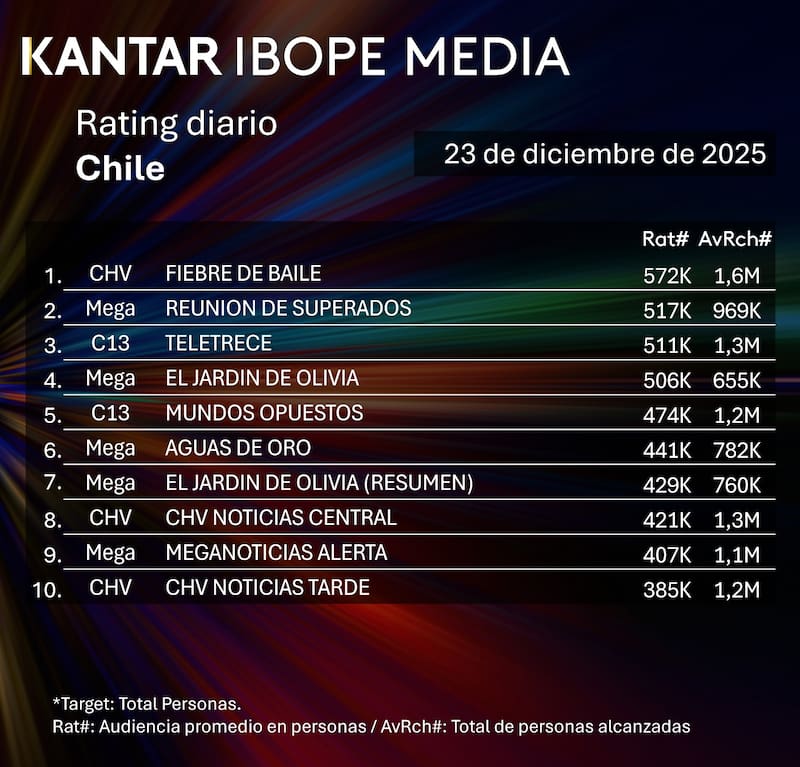 Por Equipo de GrowthRating del martes 23 de diciembre en Chile: cómo le fue a CHV, Mega, Canal 13 y TVN