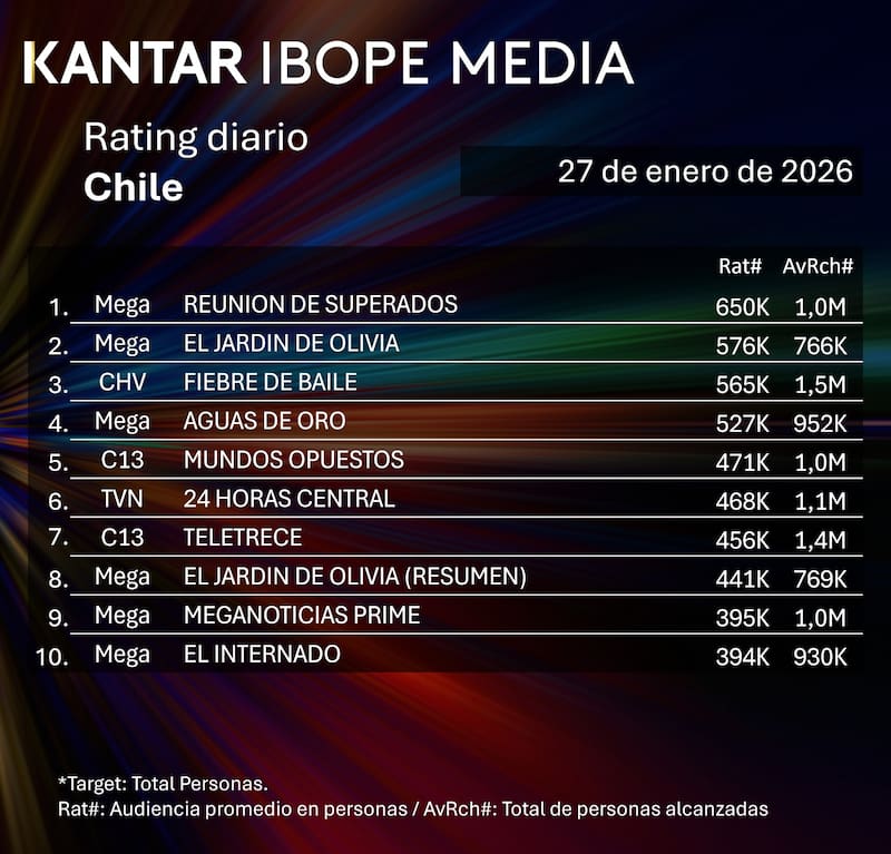 Por Equipo de GrowthRating del martes 27 de enero en Chile: cómo le fue a CHV, Mega, Canal 13 y TVN