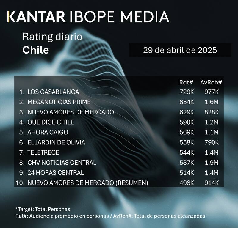 Por Baltasar DazaRating del martes 29 de abril en Chile: cómo le fue a CHV, Mega, Canal 13 y TVN