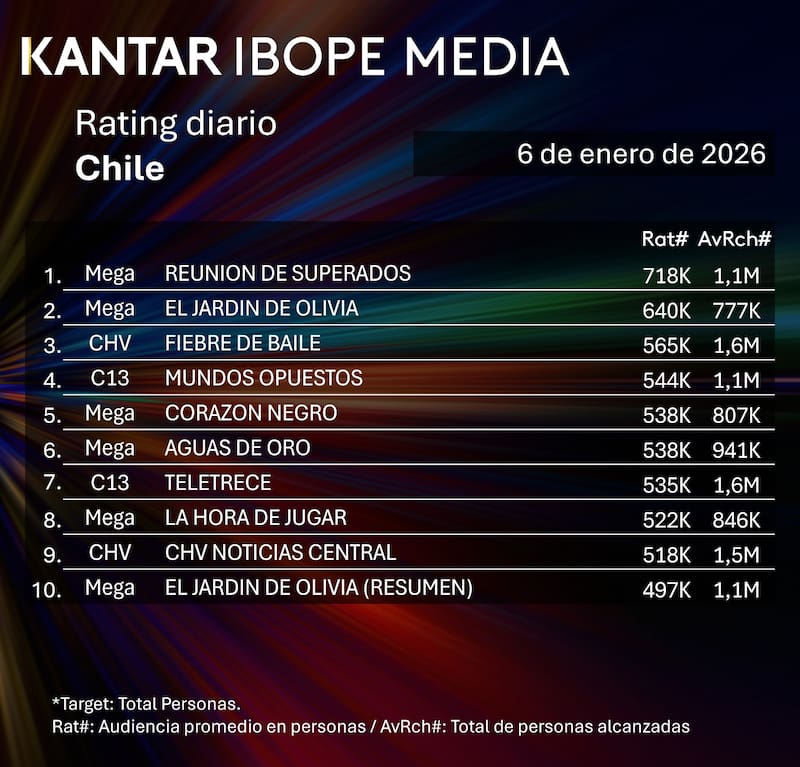 Por Equipo de GrowthRating del martes 6 de enero en Chile: cómo le fue a CHV, Mega, Canal 13 y TVN