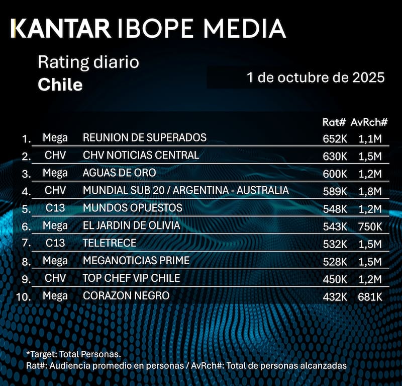 Rating del miércoles 1 de octubre en Chile: cómo le fue a CHV, Mega, Canal 13 y TVN