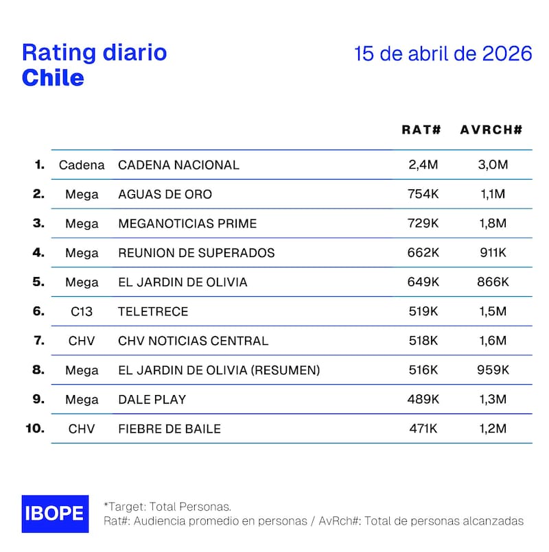 Por Equipo de GrowthRating del miércoles 15 de abril en Chile: cómo le fue a CHV, Mega, Canal 13 y TVN