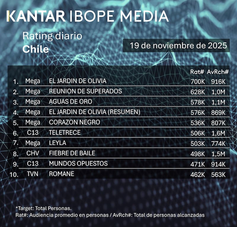 Por Equipo de GrowthRating del miércoles 19 de noviembre en Chile: cómo le fue a CHV, Mega, Canal 13 y TVN