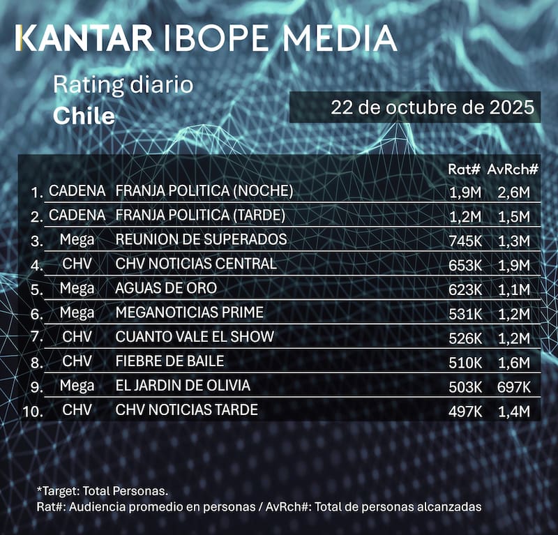 Rating del miércoles 22 de octubre en Chile: cómo le fue a CHV, Mega, Canal 13 y TVN