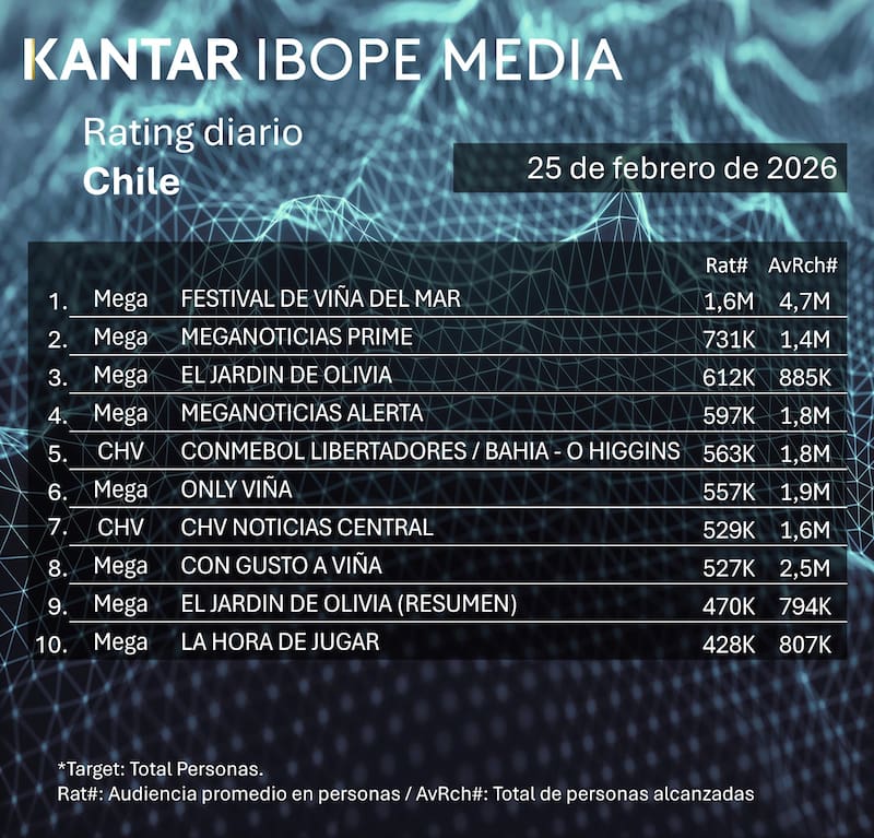 Por Equipo de GrowthRating del miércoles 25 de febrero en Chile: cómo le fue a CHV, Mega, Canal 13 y TVN