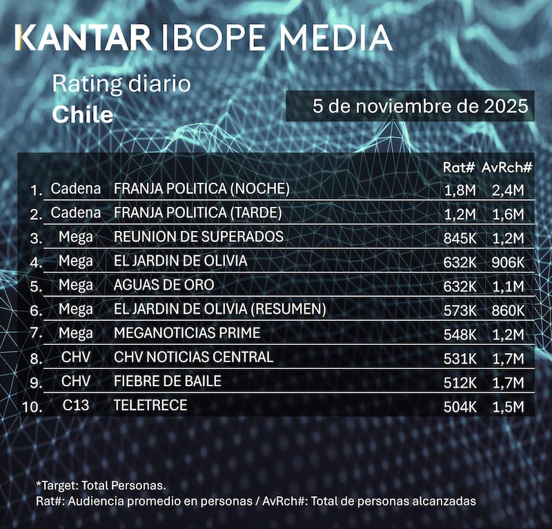 Por Equipo de GrowthRating del miércoles 5 de noviembre en Chile: cómo le fue a CHV, Mega, Canal 13 y TVN