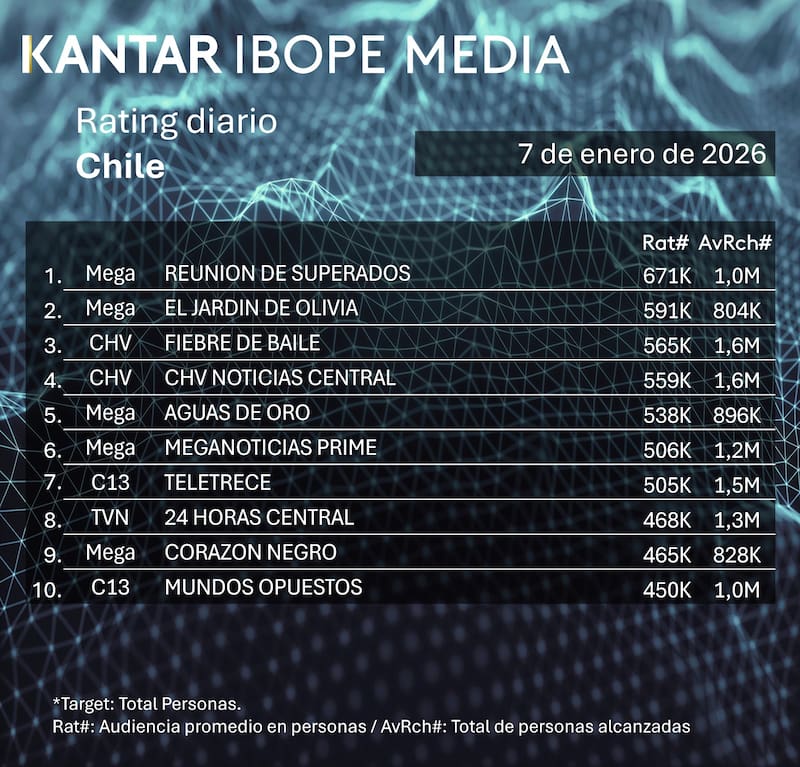 Por Equipo de GrowthRating del miércoles 7 de enero en Chile: cómo le fue a CHV, Mega, Canal 13 y TVN