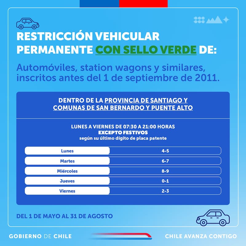 Dicha orden se mantiene en un horario de 7:30 a 21:00 horas, de lunes a viernes, a excepción de días festivos. Lo anterior aplica para motos, autos, station wagons y vehículos similares. Para buses la medida es de 10:00 a 16:00 horas, mientras que para transporte de carga es entre 10:00 y 18:00 horas.