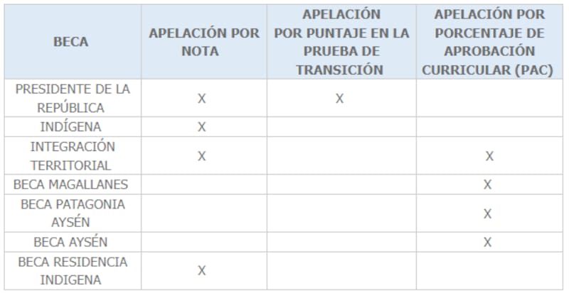 Puedes apelar solo para las becas y circunstancias indicadas en el siguiente cuadro.