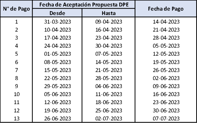 - 21 de abril de 2023: fecha de aceptación de la propuesta DPE entre el 10 y 16 de abril.