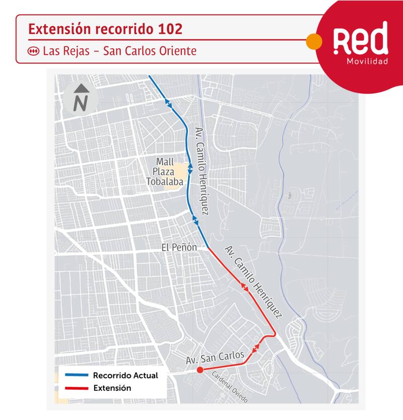 El recorrido 102 modifica su trazado con el objetivo de mejorar la conectividad en la comuna de Puente Alto, aumentando su trayecto en las avenidas Camilo Henríquez y San Carlos, llegando hasta Cardenal Oviedo.