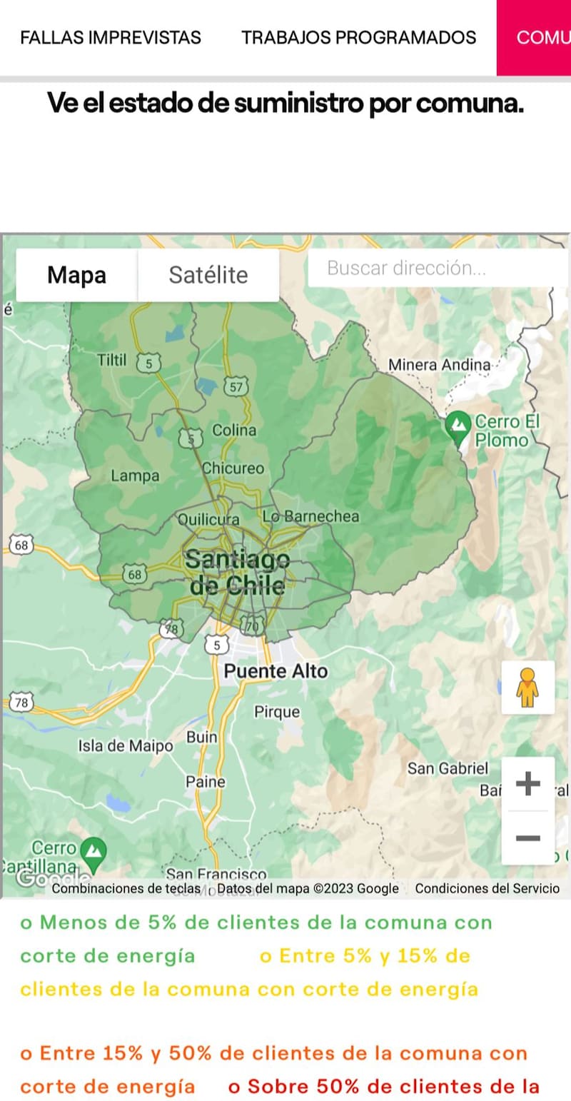 - Estado de suministro por comuna: se marca en verde cuando existe 5 % de clientes en la comuna sin energía, amarillo entre 5 % y 15 %, rojo entre 15 % y 50 % y burdeos sobre el 50 %.