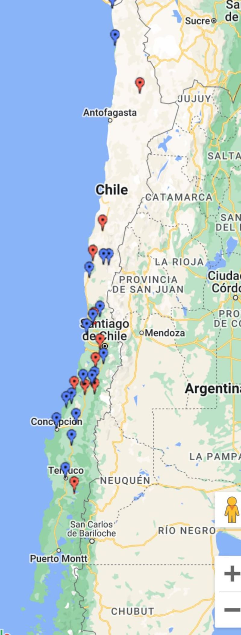 Compañía General de Electricidad Industrial S.A. (CGE): cuenta con un mapa para revisar las zonas afectadas por cortes de suministro que se actualiza cada 10 minutos con la siguiente simbología: