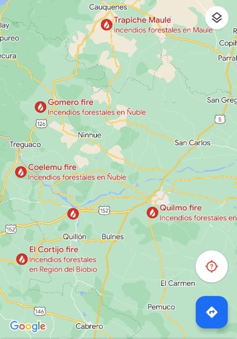 Otra herramienta que permite ubicar los focos en el mapa es la aplicación Google Maps. Al escribir “incendios forestales” se presentarán los siniestros en las distintas zonas del país. En caso que no se vean los puntos a simple vista, se debe acercar la imagen.