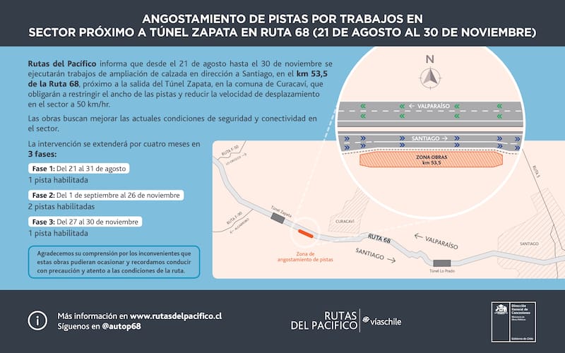 La Sociedad Concesionaria Rutas del Pacífico notificó que a contar del 27 de noviembre se pondrá en marcha la Fase 3 de los trabajos que se realizan en la Ruta 68, en el sector próximo al Túnel Zapata.