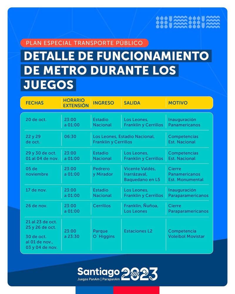 Metro de Santiago anunció que entre el 20 de octubre y el 26 de noviembre, el servicio de la Línea 6 tendrá una extensión horaria en la apertura y cierre para algunas de sus estaciones. Asimismo, ocurrirá con las Líneas 5 y 2, debido a las actividades realizadas al cierre de los juegos y las diferentes competencias que se harán en algunos recintos, como es el caso del Movistar Arena.