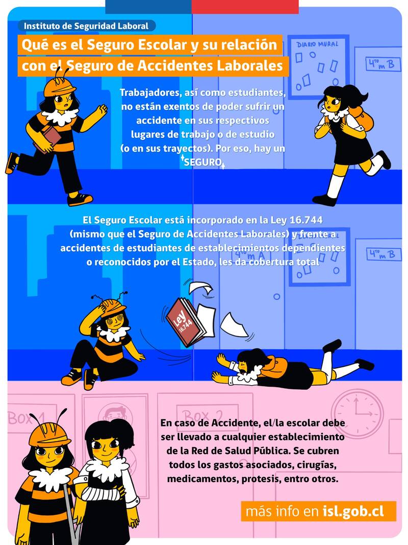 El Seguro Escolar está incorporado en la Ley 16.744, dirigido a estudiantes de establecimientos dependientes o reconocidos por el Estado, en todos los niveles, otorgándoles cobertura total de servicios de salud, en caso de sufrir accidentes .