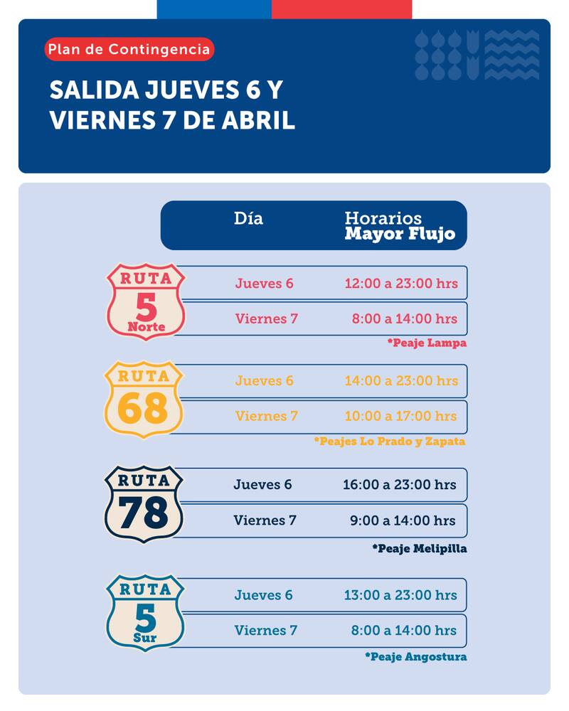 - Ruta 5 Sur de 13:00 a 21:00 horas.